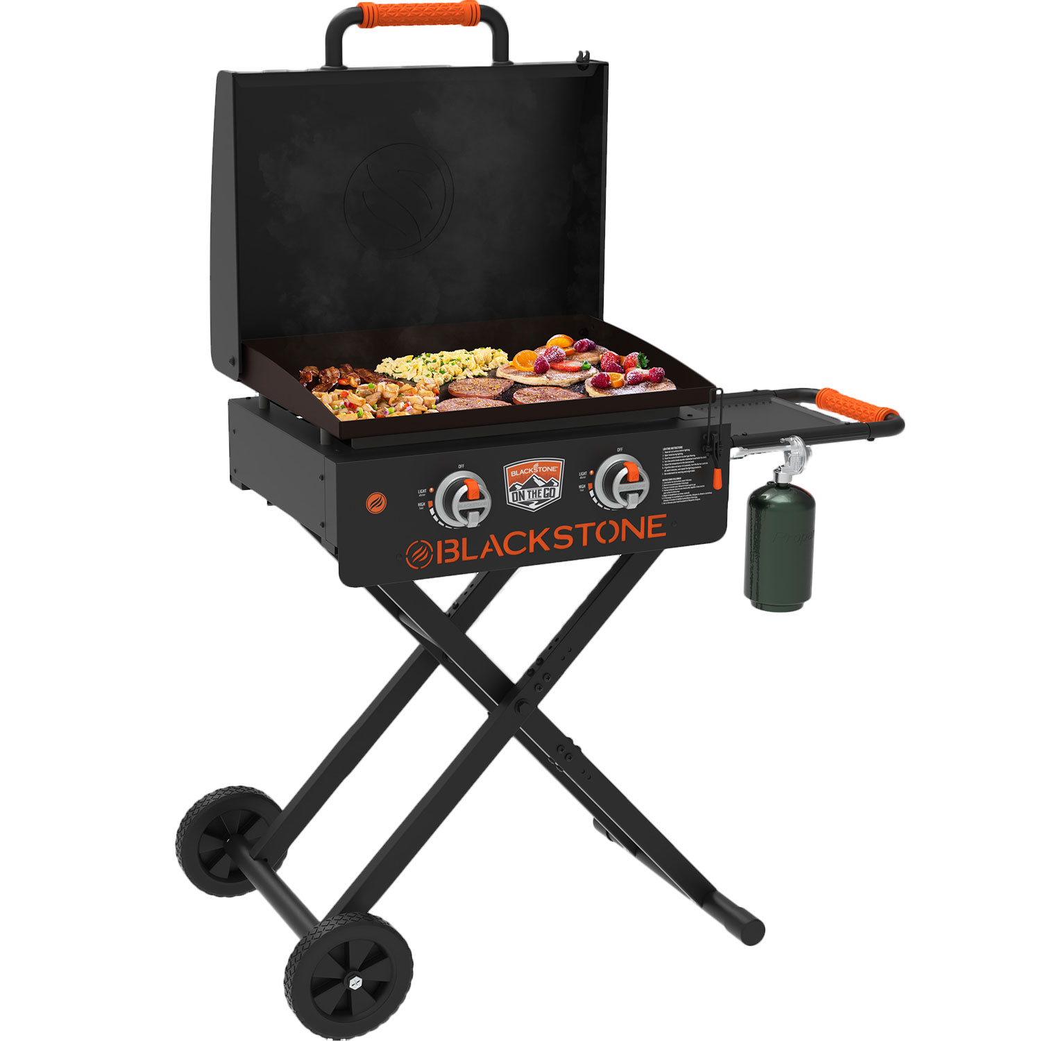 This 22″ On The Go Griddle with Scissor legs allow for easy transport and compact storage. The hood latches shut to keep your griddle top clean in all situations. The hood also allows for maximum heat retention for a number of cooking activities. The patented rear grease management system comes standard. The Blackstone On The Go Griddle makes it a great addition to any camping trip, scout outing, or backyard barbecue, allowing for a variety of meals to be cooked in the great outdoors.